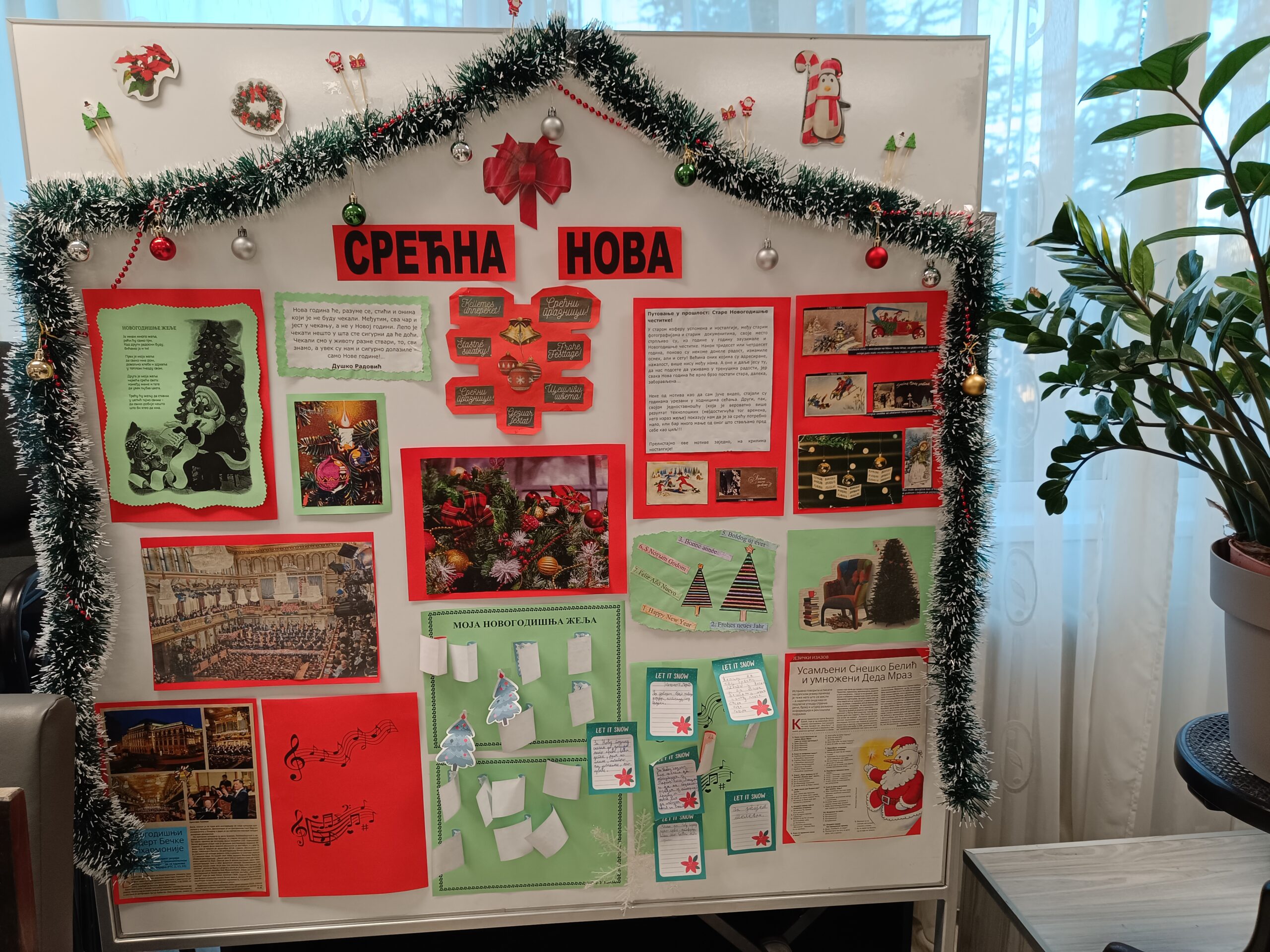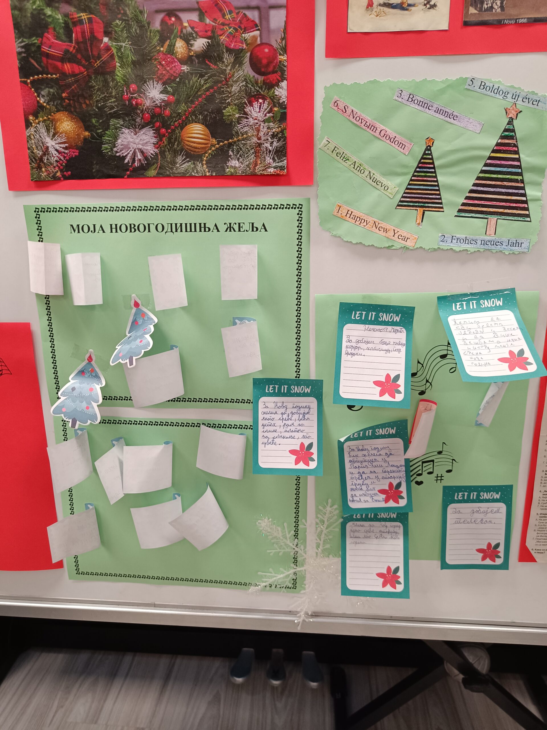 Библиотекарке наше школе уредиле су Новогодишњи пано на коме су ученици и основне и средње школе остављали цедуље са својим новогодишњим жељама.