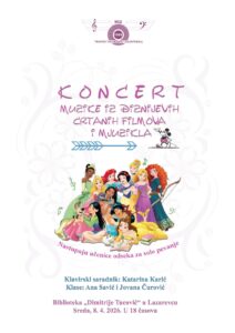 У среду, 8. априла, у библиотеци “Димитрије Туцовић” у Лазаревцу у 18 часова, одржаће се један несвакидашњи концерт ученица одсека за соло певање уз клавирску сарадњу наставнице Катарине Карић. Изузетно се радујемо и са нестрпљењем ишчекујемо да се дружимо уз најлепше песме из Дизнијевих цртаних филмова и мјузикла.