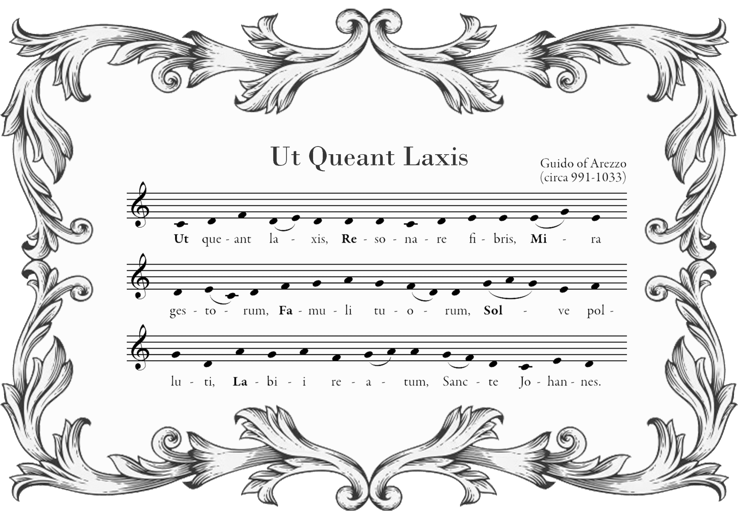 Утемељивач солфеђа и музичке теорије, Гвидо Аретински (X-XI век), први је захваљујући првим слоговима стихова Химне Светом Јовану дао имена тоновима хексахорда (шест тонова у низу): Ут, Ре, Ми, Фа, Сол, Ла. Седми тон, Си, настао је слагањем првих гласова речи Sancte Iohannes (Свети Јован).